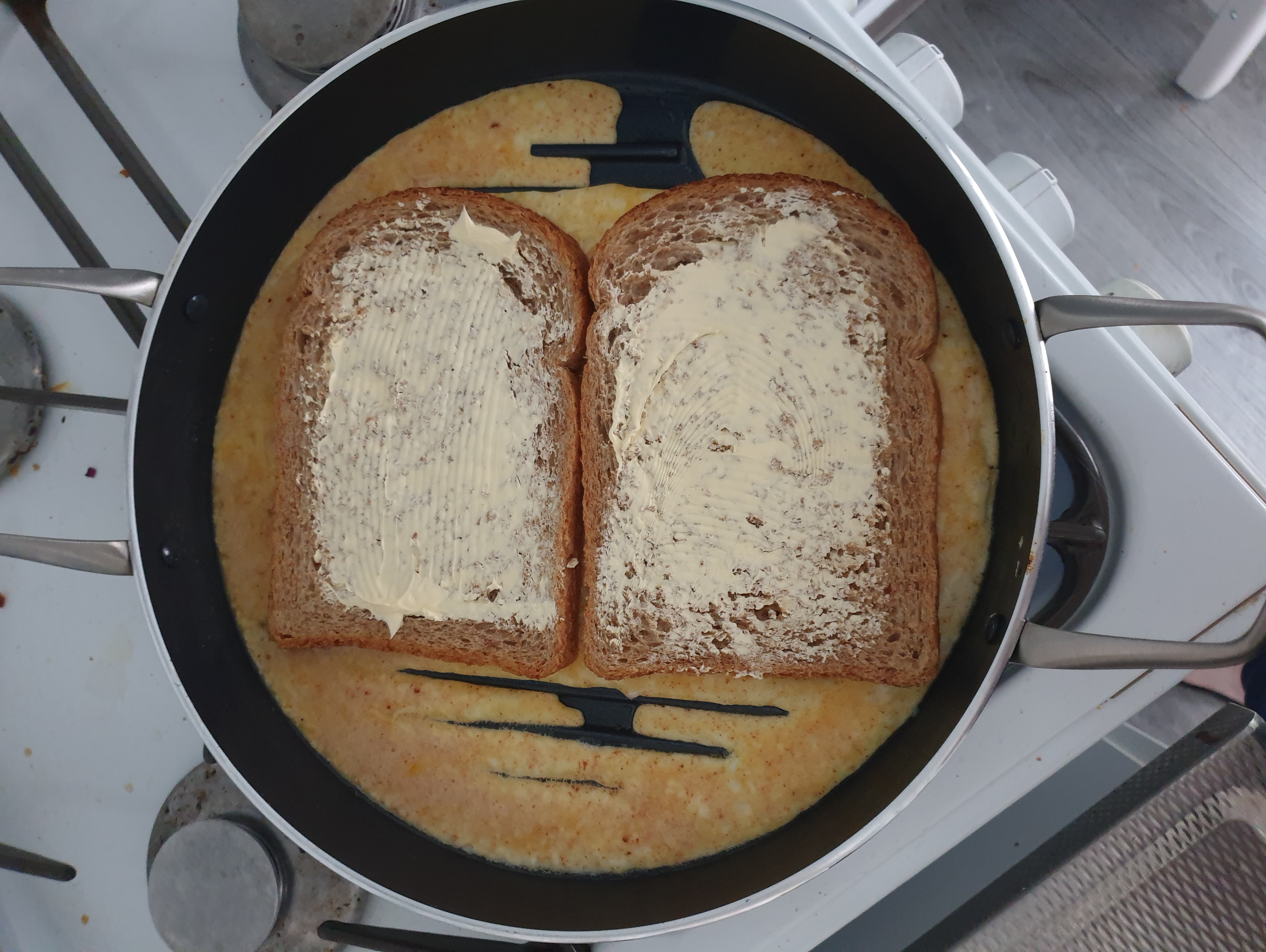 Een andere bekende hack is de sandwich met ei. Je kan natuurlijk een eitje bakken en dan op een broodje leggen maar het kan blijkbaar makkelijker. Ik heb drie eieren, geraspte kaas, knoflookpoeder en paprikapoeder gebruikt. De hack gaat als volgt. Je doet alles in een kom en klutst ze tot ze allemaal zijn samengevoegd. Als die aan de randen goed gaat is leg je 2 broodjes met boter op, met de boter aan de bovenkant. Als de eieren goed gebakken zijn flip je hem om. Laat hem nog even verder gaten en vouw dan de broodjes op elkaar, eventueel kan je de randjes naar binnen vouwen. En