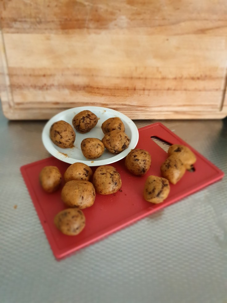 Cookiedough van kikkererwten… Ik zie mensen al heeeel bedenkelijk kijken. Ja, het kan. Ook ik had mijn twijfels maar je moet het dan toch proberen. Ik heb recepten opgezocht en kwam op die van foodness terecht. Deze zagen er erg lekker uit. Daarnaast, hoe fijn is het dat je niks weg hoeft te gooien. Het milieu zal weer blij met mij zijn. Het maken ervan heeft misschien wat voorbereiding nodig. Tip is al dat je de chocolade alvast moet hakken. Ik was dit vergeten en daardoor duurde het langer. Als je deeg te zacht is kan je er wat bloem bij doen, denk ik ten minste. Het werkte, yess. Het draaien van de balletjes gaat ook veel beter als je deeg stevig is. Het mag best wat plakkerig zijn, dan zijn je handen misschien wat viezer. Ik had weer eens een snee in mijn vinger dus ik had handschoenen aan, ik vond dat super fijn werken. Geen vieze handen en mooie gladde balletjes. Daarna doe je ze een uur in de vriezer en als ze koud zijn kan je ze bedekken met chocolade. Eigenlijk was het heel erg makkelijk maar smaakt het ook lekker? Zeker. Ik heb wel gebruik gemaakt van vanillearoma ipv een vanillestokje, dit had ik namelijk nog in huis. Als je niet zou weten dat het van kikkererwten is gemaakt zou je het zeker niet proeven.
