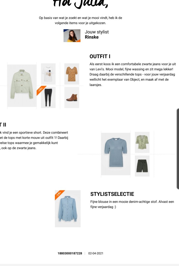 Het is zeker een aanrader als je jezelf wilt verrassen of je jezelf iets leuks wilt geven. Tuurlijk zal niet alles je stijl zijn, helemaal niet als je daarin wel wat kritisch bent. Je stuurt het gratis terug en houd je niks, dan betaal je 10 euro aan servicekosten, wat vrij logisch is gezien de moeite die de styliste heeft gedaan. Zal ik het vaker doen, geen idee. Misschien voor een speciale gelegenheid maar anders ga ik gewoon weer fysiek shoppen, als dat weer mag.