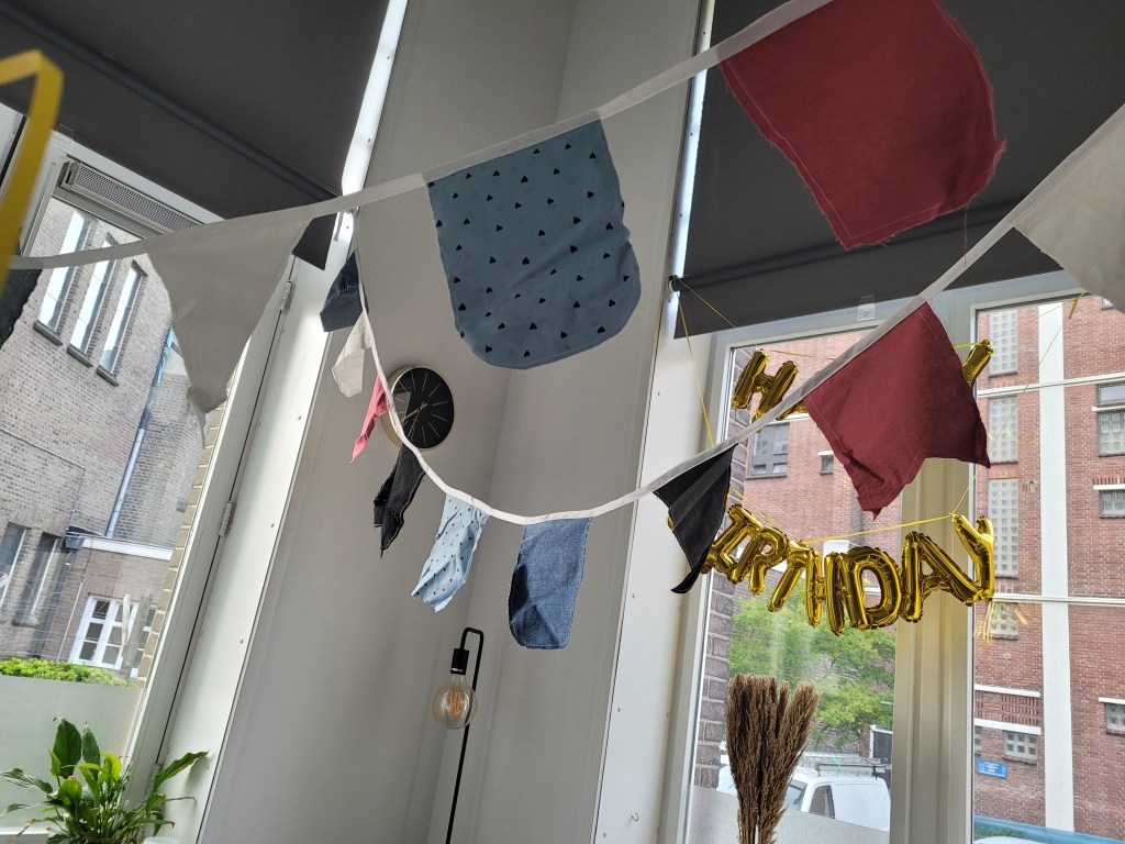 Door alle vrije dagen was het wat een gekke week maar woensdag was wel een hoogtepunt. Je verjaardag vieren met de kids is toch wel erg leuk. Ook al waren veel kinderen er niet, toch was het leuk. Een klein, ontspannen clubje. Mijn collega’s hebben we ook echt jarig laten voelen. Ik heb een prachtige hoed gekregen, altijd leuk. Thuis had ik ook al slingers opgehangen, ook die ik zelf heb gemaakt. Ik had ze misschien moeten strijken maar ik vind ze erg leuk geworden.