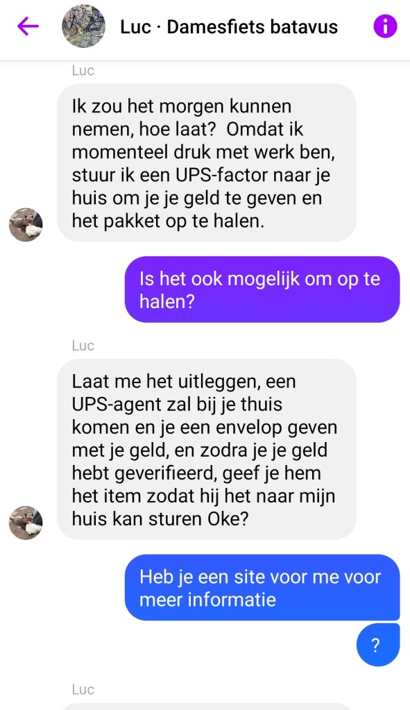 Ik was toe aan een nieuwe fiets na 12 jaar. Op een gegeven moment kan je wel blijven repareren maar nu was de reparatie meer waard dan de fiets. En zodra ik een idee heb dan gaat dat niet meer uit mijn hoofd. Die week heb ik nog een nieuwe gekocht en mijn oude op Marketplace van Facebook gezet. Ik heb er nooit problemen mee ervaren dus dat kon vast geen kwaad. Maar daar kwam de eerste. Ze wilde hem wel kopen en zou dan een HAPPY-POST postbode naar mij sturen met het geld en dan neemt de postbode de fiets mee. Nu bestaat HAPPY-POST wel maar niet in Nederland. Toen ik vroeg of ze meer informatie had en vroeg naar een website kapte ze het gesprek af, blijkbaar kwam ik te dichtbij. En poef, het profiel was verdwenen.